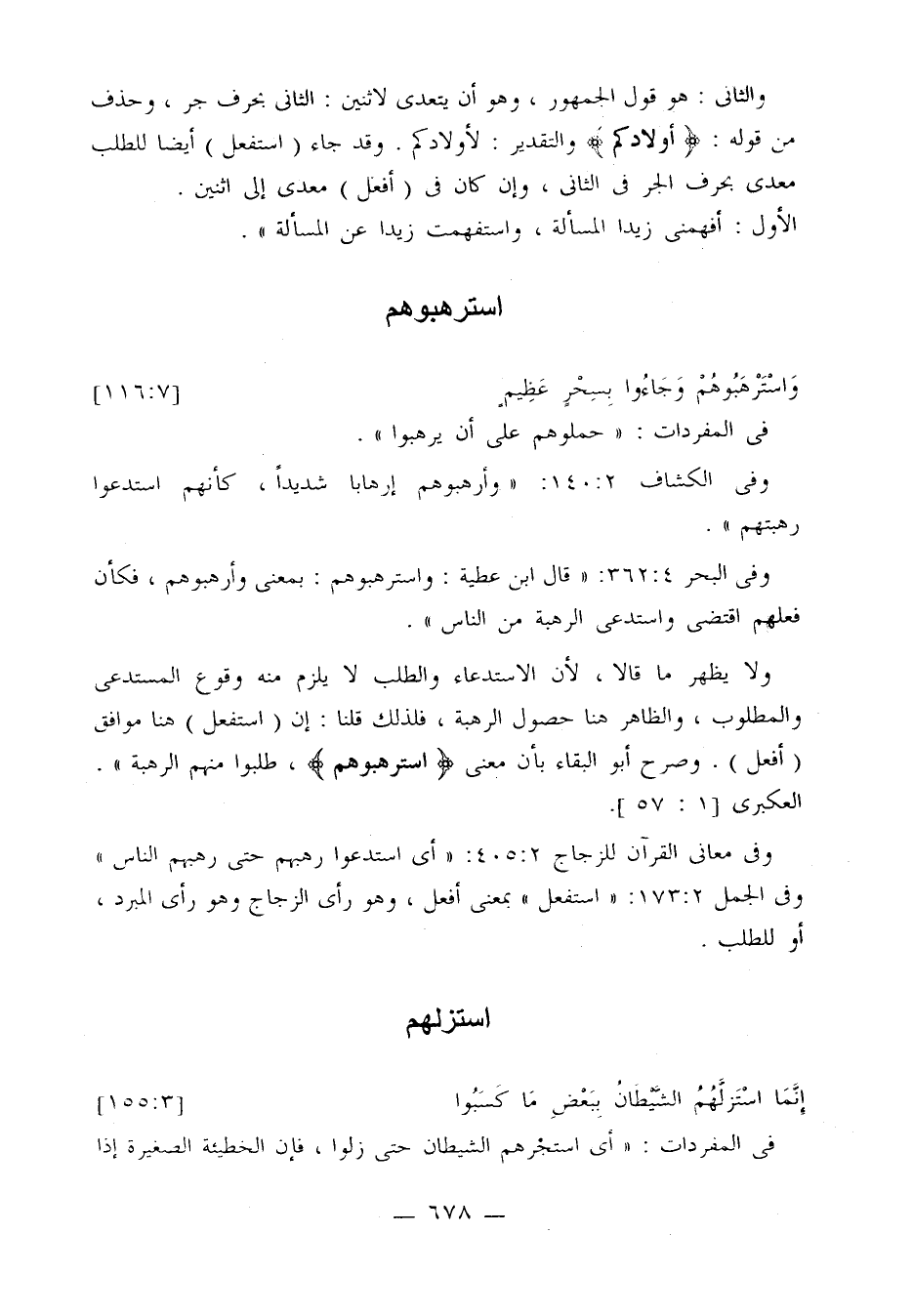 ولا يظهر ما قالا، لأن الاستدعاء والطلب لا يلزم منه وقوع المستدعى والمطلوب، والظاهر هنا حصول الرهبة، فلذلك قلنا: إن (استفعل) هنا موافق (أفعل). وصرح أبو البقاء بأن معنى {استرهبوهم}، طلبوا منهم الرهبة. العكبري 1: 57.