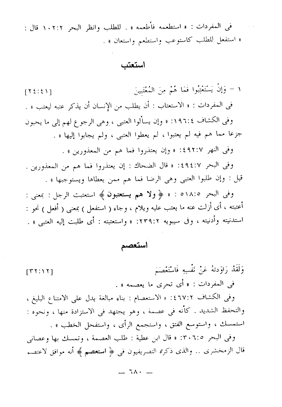 وفي البحر 5: 518: «{ولا هم يستعتبون} استعتبت الرجل: بمعنى: أعتبته، أي أزلت عنه ما يعتب عليه ويلام، وجاء (استفعل) بمعنى (أفعل) نحو: استدنيته وأدنيته، وفي سيبويه 2: 239: واستعتبته: أي طلبت إليه العتبى».