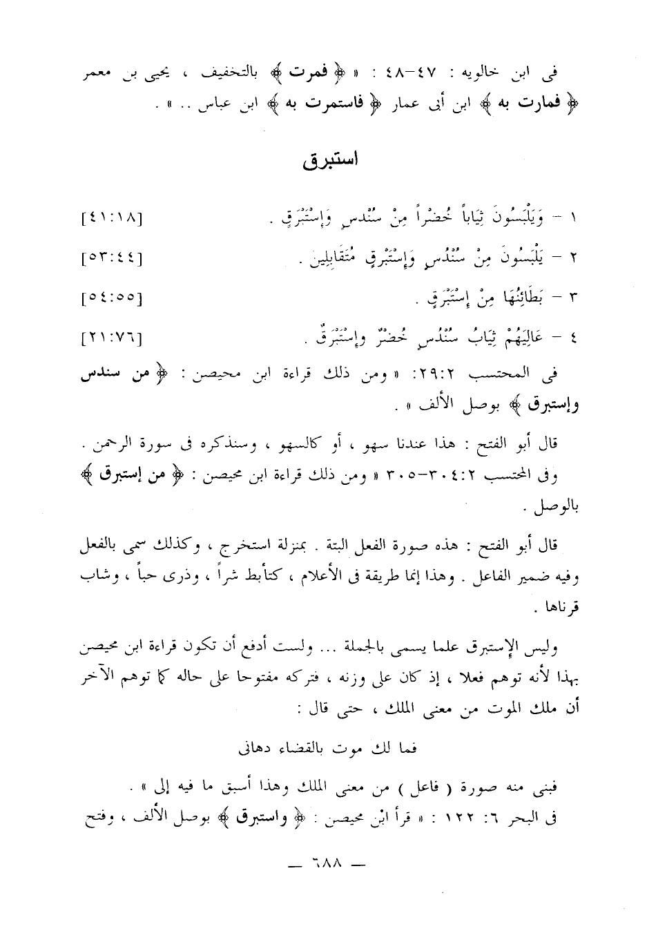 وليس الإستبراق علما يسمى بالجملة ... ولست أدفع أن تكون قراءة ابن محيصن بهذا لأنه توهم فعلا، إذ كان على وزنه، فتركه مفتوحا على حاله كما توهم الآخر أن ملك الموت من معنى الملك، حتى قال: