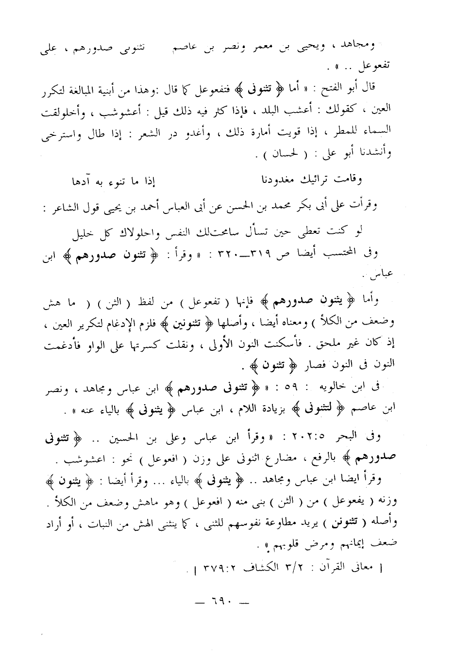 ومجاهد، ويحيى بن معمر ونصر بن عاصم ... تثنوني صدورهم، على تفعوعل ...».