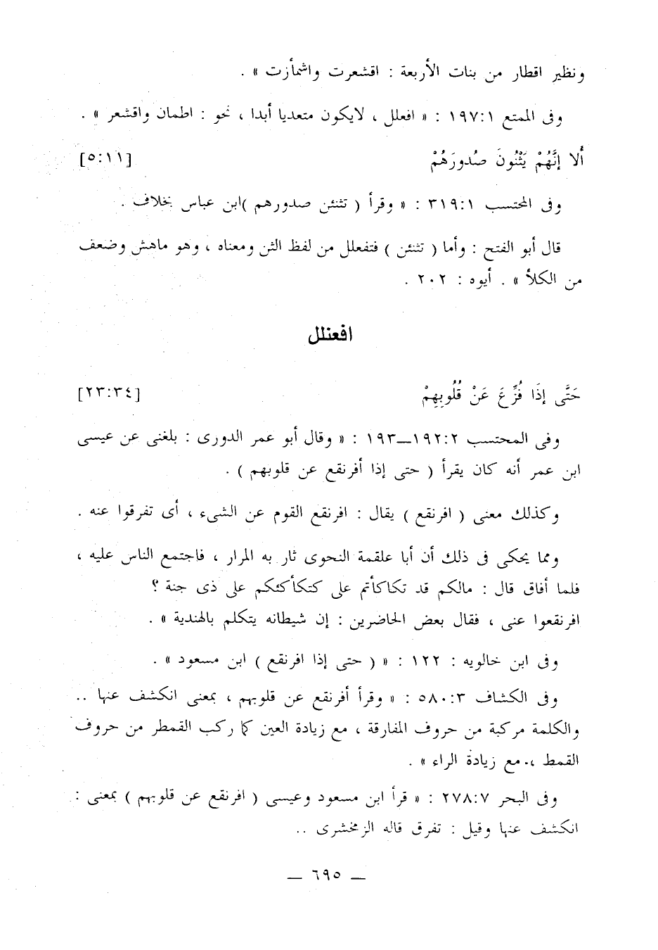 وفي الكشاف 3: 580: «وقرأ أفرنقع عن قلوبهم، بمعنى انكشف عنها ... والكلمة مركبة من حروف المفارقة، مع زيادة العين كما ركب القمطر من حروف القمط، مع زيادة الراء».