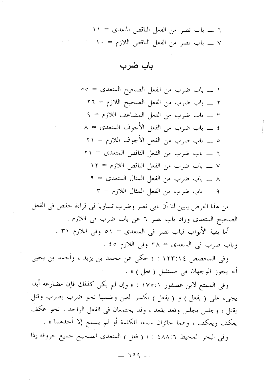 أما بقية الأبواب فباب نصر في المتعدي = 51 وفي اللازم 31.
