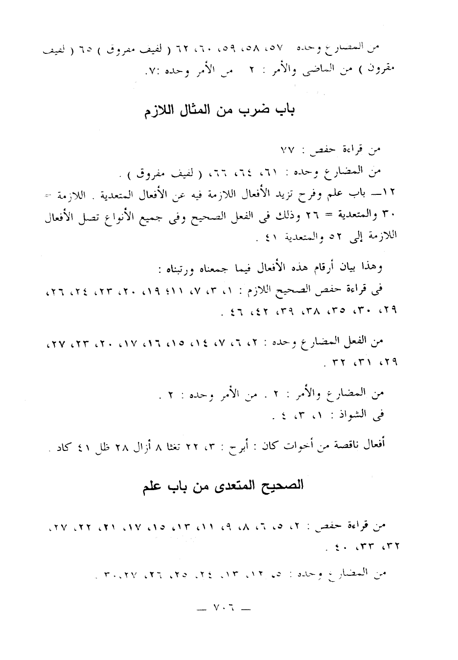 12 - باب علم وفرح تزيد الأفعال اللازمة فيه عن الأفعال المتعدية. اللازمة = 30 والمتعدية 26 وذلك في الفعل الصحيح وفي جميع الأنواع تصل الأفعال اللازمة إلى 52 والمتعدية 41.