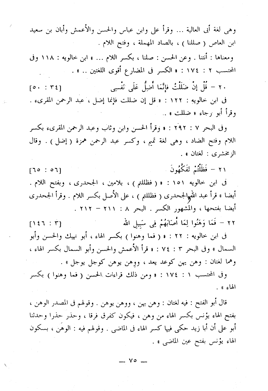 في ابن خالويه 151: «(فظللتم) بلامين، الجحدري، وبفتح اللام. أيضًا» قرأ عبد الله الجحدري (فظللتم) على الأصل بكسر اللام. وقرأ الجحدري أيضًا بفتحها، والمشهور الكسر. البحر 8: 211 - 212.