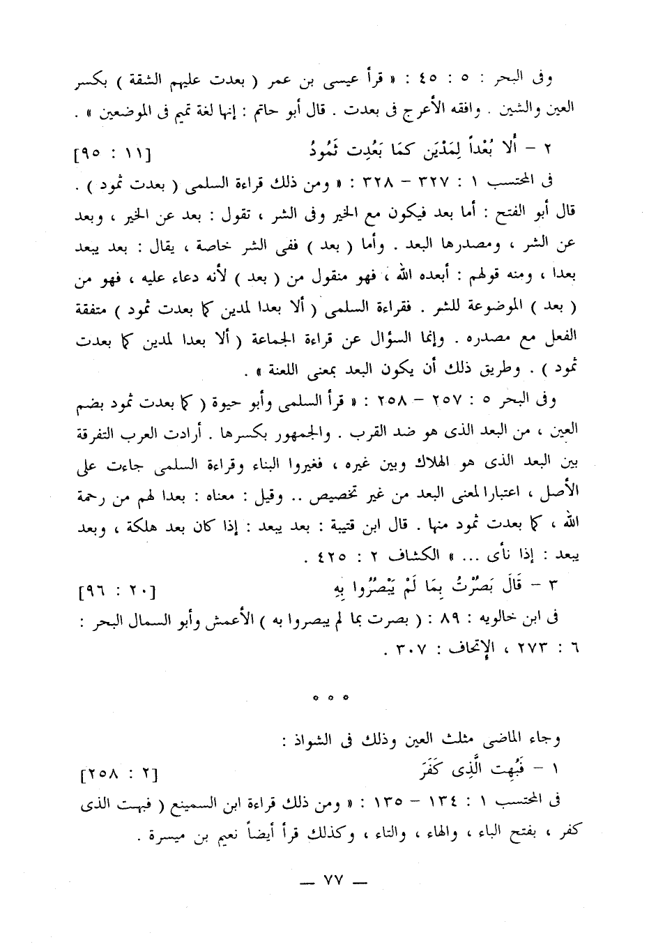 في المحتسب 1: 327 - 328: «ومن ذلك قراءة السلمى (بعدت ثمود). قال أبو الفتح: أما بعد فيكون مع الخير وفي الشر، تقول: بعد عن الخير، وبعد عن الشر، ومصدرها البعد. وأما (بعد) ففي الشر خاصة، يقال: بعد يبعد بعدا، ومنه قولهم: أبعده الله، فهو منقول من (بعد) لأنه دعاء عليه، فهو من (بعد) الموضوعة للشر. فقراءة السلمي (ألا بعدا لمدين كما بعدت ثمود) متفقة الفعل مع مصدره. وإنما السؤال عن قراءة الجماعة (ألا بعدا لمدين كما بعدت ثمود). وطريق ذلك أن يكون البعد بمعنى اللعنة».