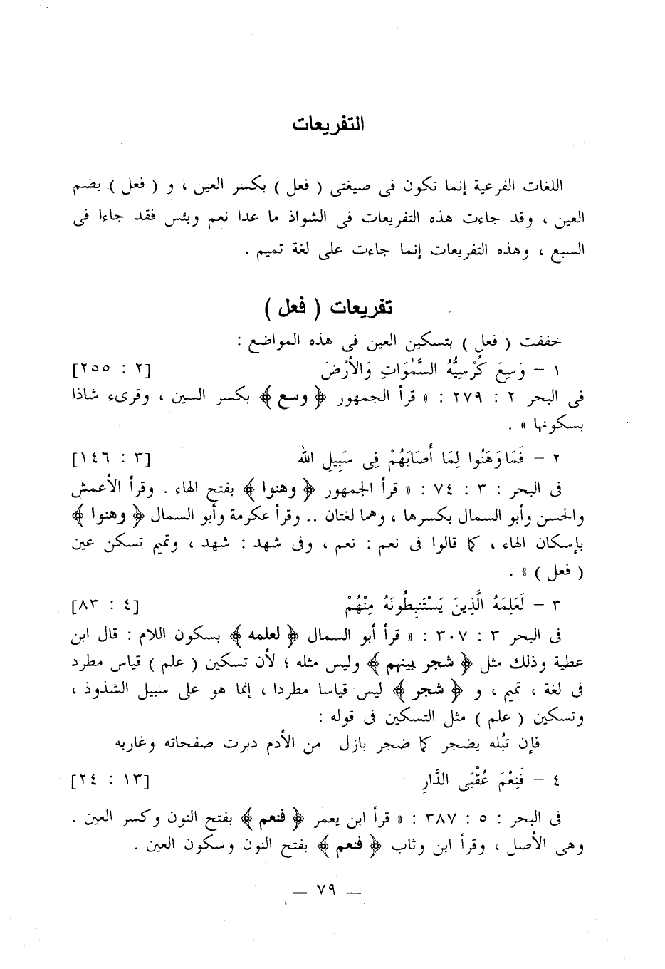 في البحر 3: 307: «قرأ أبو السمال {لعلمه} بسكون اللام: قال ابن عطية وذلك مثل {شجر بينهم} وليس مثله؛ لأن تسكين (علم) قياس مطرد في لغة، تميم، و {شجر} ليس قياسا مطردًا، إنما هو على سبيل الشذوذ، وتسكين (علم) مثل التسكين في قوله: