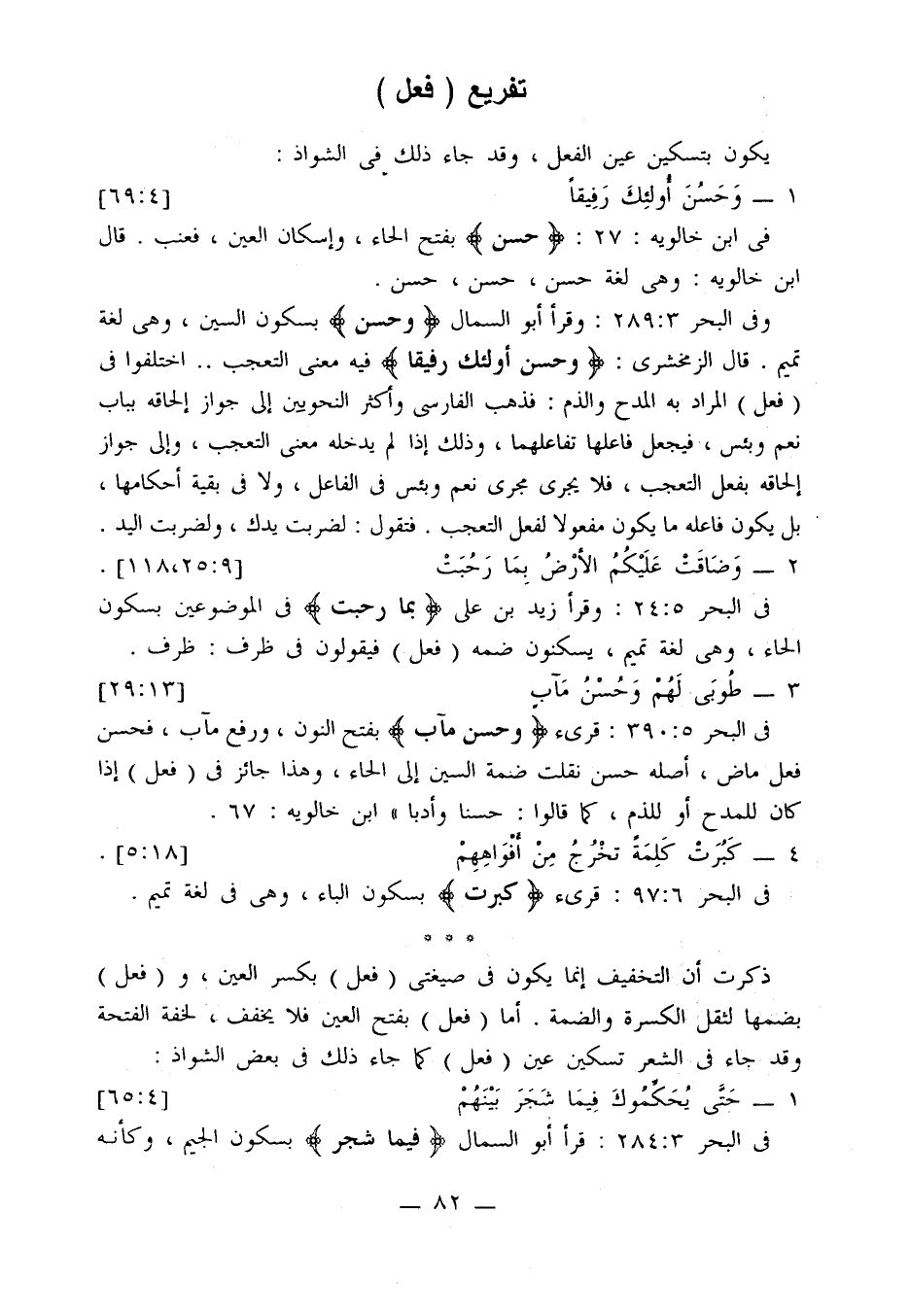 وفي البحر 3: 289: وقرأ أبو السمال {وحسن} بسكون السين، وهي لغة تميم. قال الزمخشري: {وحسن أولئك رفيقا} فيه معنى التعجب ... اختلفوا في (فعل) المراد به المدح والذم: فذهب الفارسي وأكثر النحويين إلى جواز إلحاقه بباب نعم وبئس، فيجعل فاعلها تفاعلهما، وذلك إذا لم يدخله معنى التعجب، وإلى جواز إلحاقه بفعل التعجب، فلا يجرى مجرى نعم وبئس في الفاعل، ولا في بقية أحكامها، بل يكون فاعله ما يكون مفعولا لفعل التعجب. فتقول: لضربت يدك، ولضربت اليد.