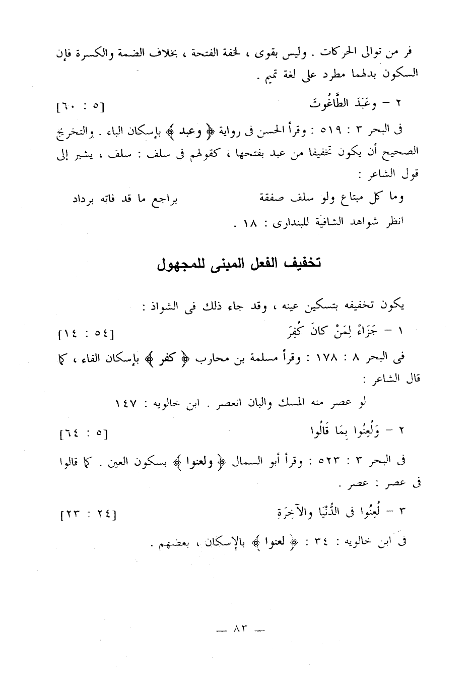 في البحر 3: 523: وقرأ أبو السمال {ولعنوا} بسكون العين. كما قالوا في عصر: عصر.
