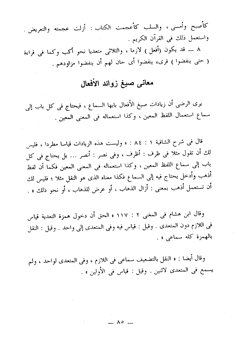 قال في شرح الشافية 1: 84: «وليست هذه الزيادات قياسًا مطردًا، فليس لك أن تقول مثلا في ظرف: أظرف، وفي نصر: أنصر .... بل يحتاج في كل باب إلى سماع اللفظ المعين، وكذا استعماله في المعنى المعين فكما أن لفظ أذهب وأدخل يحتاج فيه إلى السماع فكذا معناه الذي هو النقل مثلاً؛ فليس لك أن تستعمل أذهب بمعنى: أزال الذهاب، أو عرض للذهاب، أو نحو ذلك».