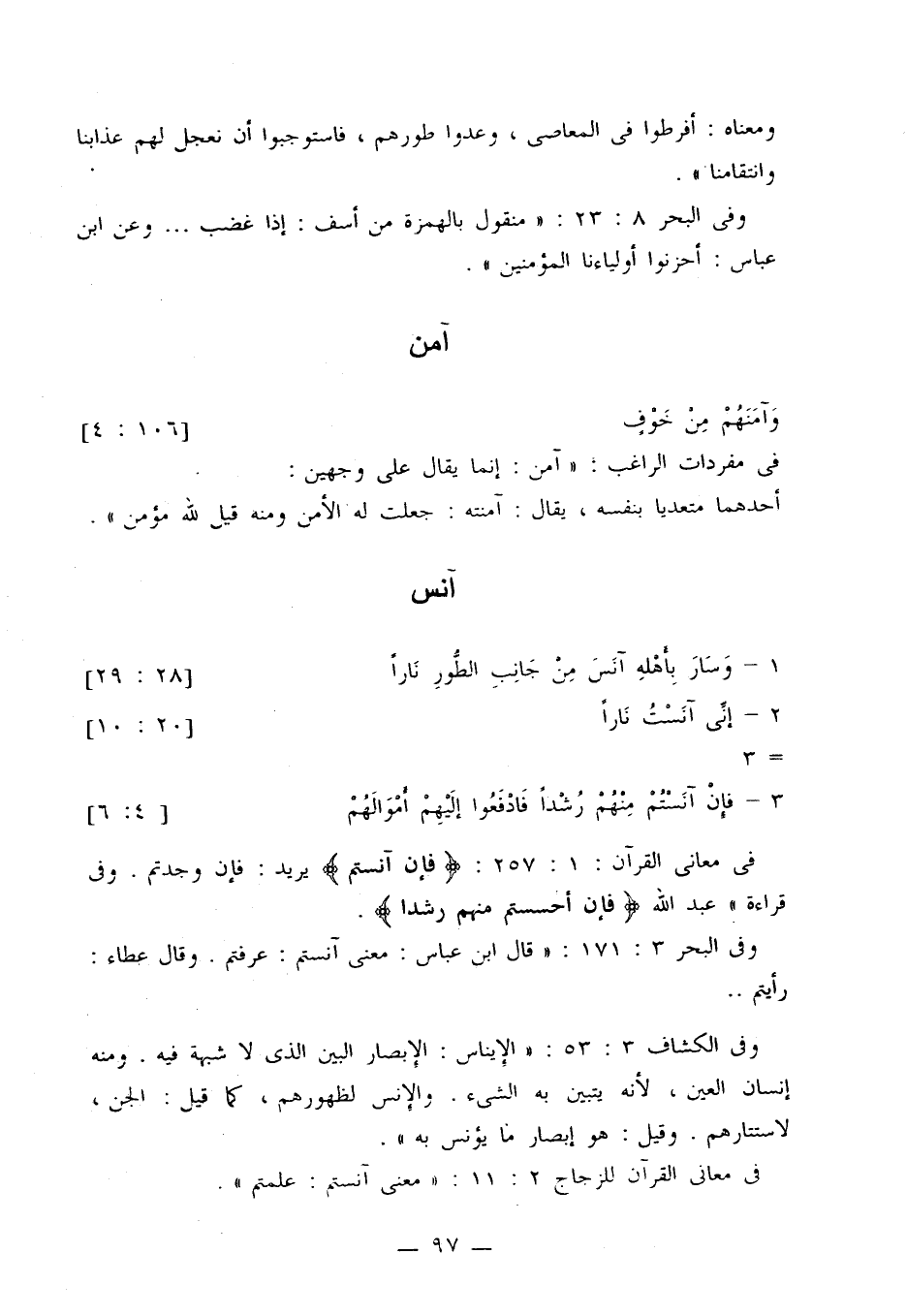 في مفردات الراغب: «آمن: إنما يقال على وجهين: أحدهما متعديًا بنفسه، يقال: آمنته: جعلت له الأمن ومنه قيل لله مؤمن».
