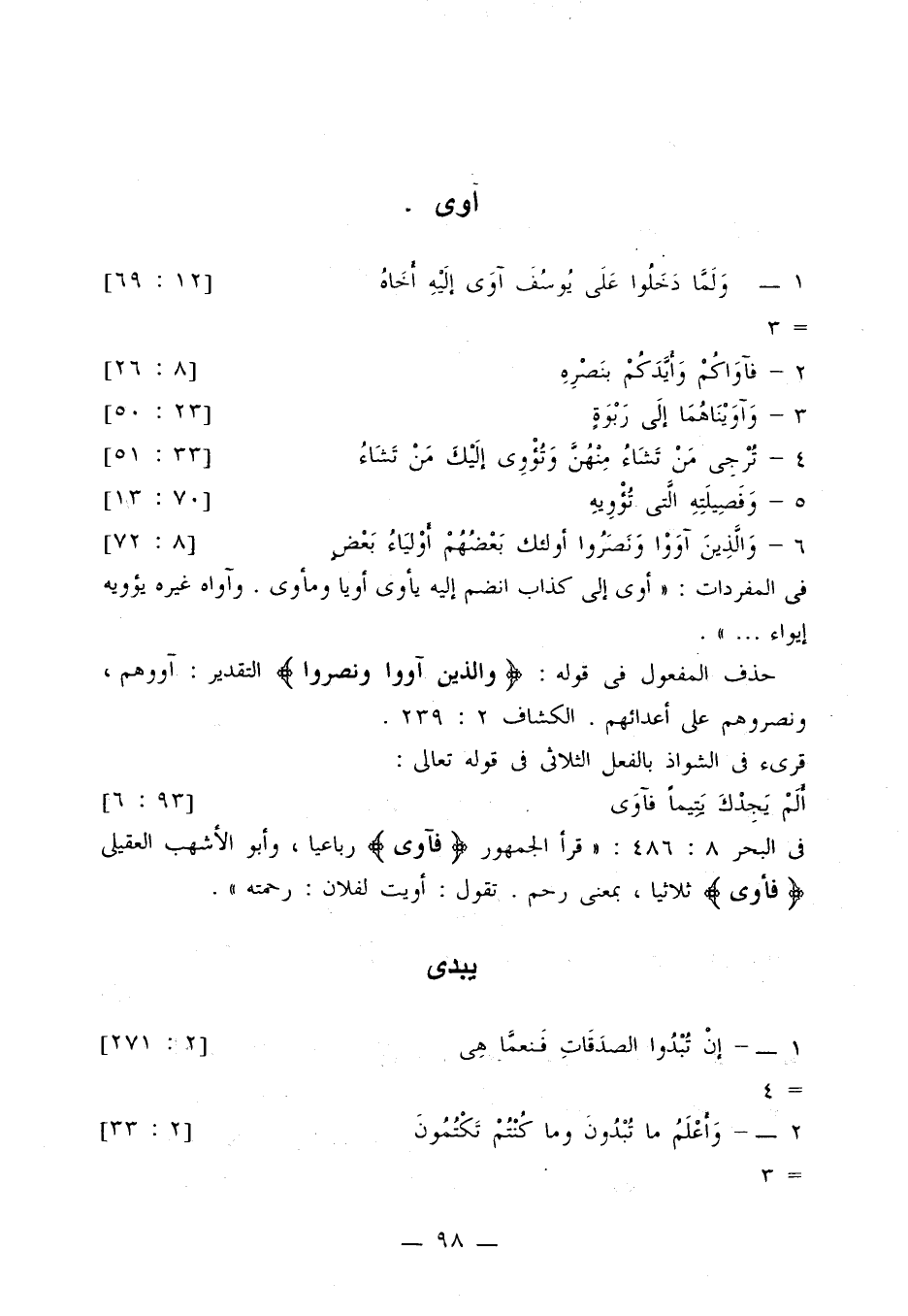 في البحر 8: 486: «قرأ الجمهور {فآوى} رباعيا، وأبو الأشهب العقيلي {فأوى} ثلاثيا، بمعنى رحم. تقول: أويت لفلان: رحمته».