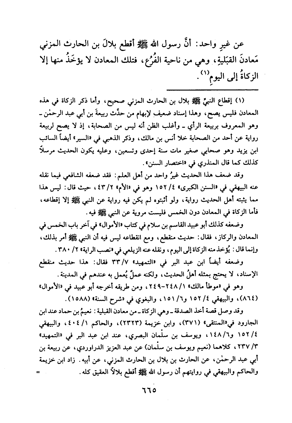 (¬١) إقطاع النبي - صلَّى الله عليه وسلم - بلال بن الحارث المزني صحيح، وأما ذكر الزكاة في هذه المعادن فليس يصح، وهذا إسناد ضعيف لإبهام من حدَّث ربيعةَ بن أبي عبد الرحمن - وهو المعروف بربيعة الرأي - وأغلب الظن أنه ليس من الصحابة، إذ لا يصح لربيعة رواية عن أحد من الصحابة خلا أنس بن مالك، وذكر الذهبي في "السير" أيضاً السائب ابن يزيد وهو صحابي صغير مات سنة إحدى وتسعين، وعليه يكون الحديث مرسلاً كذلك كما قال المنذري في "اختصار السنن".