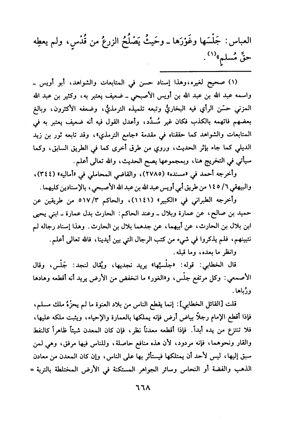 قلت [القائل الخطابي]: إنما يقطع الناس من بلاد العنوة ما لم يحزْهُ ملك مسلم، فإذا أقطع الإمام رجلاً بياض أرض فإنه يملكها بالعمارة والإحياء، ويثبت ملكه عليها، فلا تنتزع من يده أبداً. فإذا أقطعه معدناً نظر، فإن كان المعدن شيئاً ظاهراً كالنفط والقار ونحوهما، فإنه مردود، لأن هذه منافع حاصلة، وللناس فيها مرفق، وهي لمن سبق إليها، ليس لأحد أن يمتلكها فيستأثر بها على الناس، وإن كان المعدن من معادن الذهب والفضة أو النحاس وسائر الجواهر المستكنة في الأرض المختلطة بالتربة =