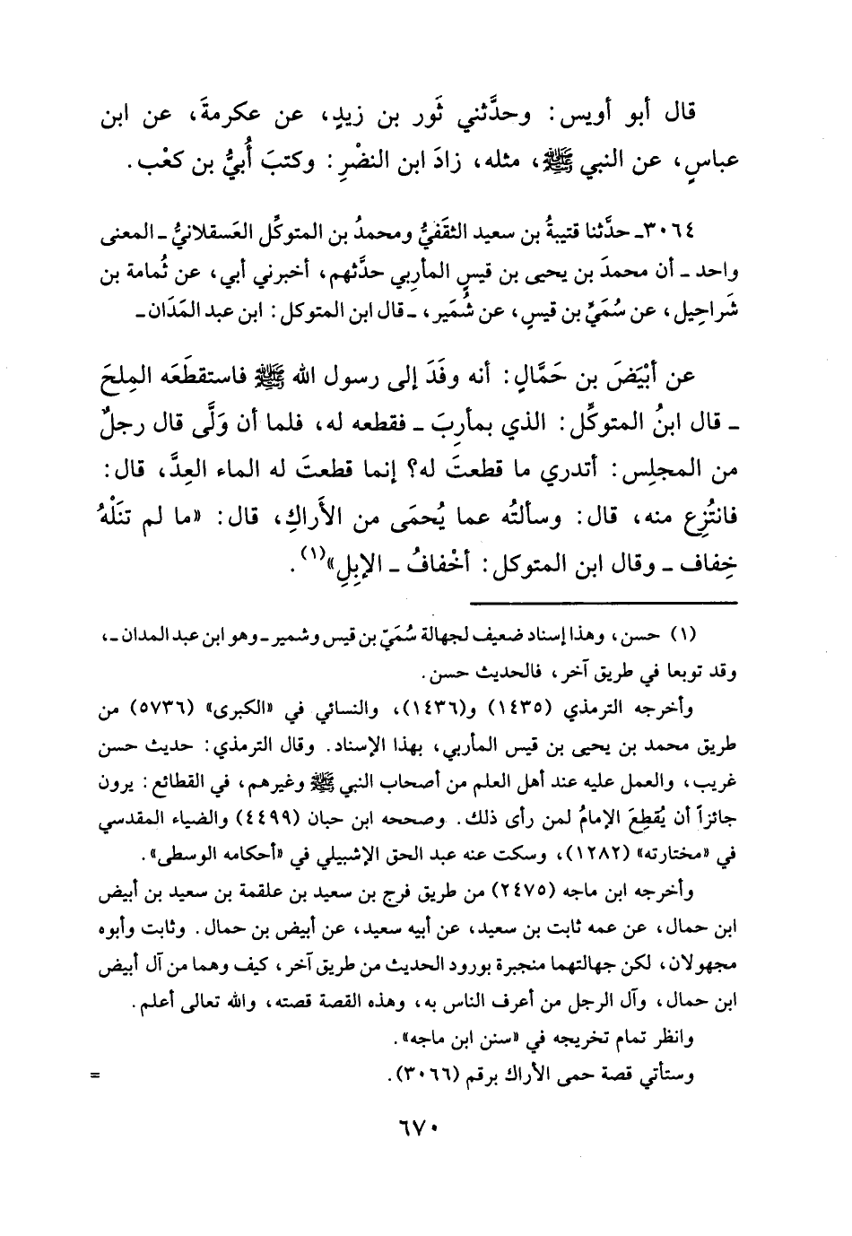 عن أبْيَضَ بن حَمَّالٍ: أنه وفَدَ إلى رسول الله - صلَّى الله عليه وسلم - فاستقطَعَه المِلحَ - قال ابنُ المتوكِّل: الذي بمأرِبَ - فقطعه له، فلما أن وَلَّى قال رجلٌ من المجلِس: أتدري ما قطعتَ له؟ إنما قطعتَ له الماء العِدَّ، قال: فانتُزِع منه، قال: وسألتُه عما يُحمَى من الأَراكِ، قال: "ما لم تنَلْهُ خِفاف - وقال ابن المتوكل: أخْفافُ - الإبِلِ" (¬١).