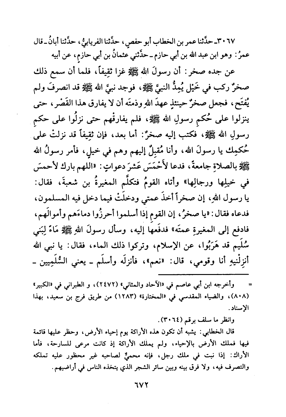 عن جده صخر: أن رسولَ الله - صلَّى الله عليه وسلم - غزا ثقِيفاً، فلما أن سمع ذلك صخرٌ ركب في خَيْل يُمِدُّ النبيَّ - صلَّى الله عليه وسلم -، فوجد نبيَّ الله - صلَّى الله عليه وسلم - قد انصرفَ ولم يُفتَح، فجعل صخرٌ حينئذٍ عهدَ اللهِ وذمتَه أن لا يفارق هذا القَصْر، حتى ينزلوا على حُكمِ رسولِ الله - صلَّى الله عليه وسلم -، فلم يفارقْهم حتى نزلُوا على حكمِ رسولِ الله - صلَّى الله عليه وسلم -، فكتب إليه صخر: أما بعد، فإن ثقِيفاً قد نزلتْ على حُكمِك يا رسولَ الله، وأنا مُقبِلٌ إليهم وهم في خيلٍ، فأمر رسولُ الله - صلَّى الله عليه وسلم - بالصلاةِ جامعةً، فدعا لأَحْمَسَ عَشرَ دعواتٍ: "اللهم بارك لأحمسَ في خيلِها ورجالِها" وأتاه القومُ فتكلَّم المغيرةُ بن شعبةَ، فقال: يا رسول اللهِ، إن صخراً أخذَ عمتي ودخلَتْ فيما دخل فيه المسلمون، فدعاه فقال: "يا صخرُ، إن القومِ إذا أسلموا أحرزُوا دماءَهم وأموالَهم، فادفع إلى المغيرةِ عمتَه" فدفَعها إليه، وسأل رسولَ اللهِ - صلَّى الله عليه وسلم - مَاءً لِبَني سُلَيم قد هَرَبُوا، عن الإسلام، وتركوا ذلك الماء، فقال: يا نبي الله أنزِلْنيهِ أنا وقومي، قال: "نعم"، فانزلَه وأسلَم -يعني السُّلَمِيين-