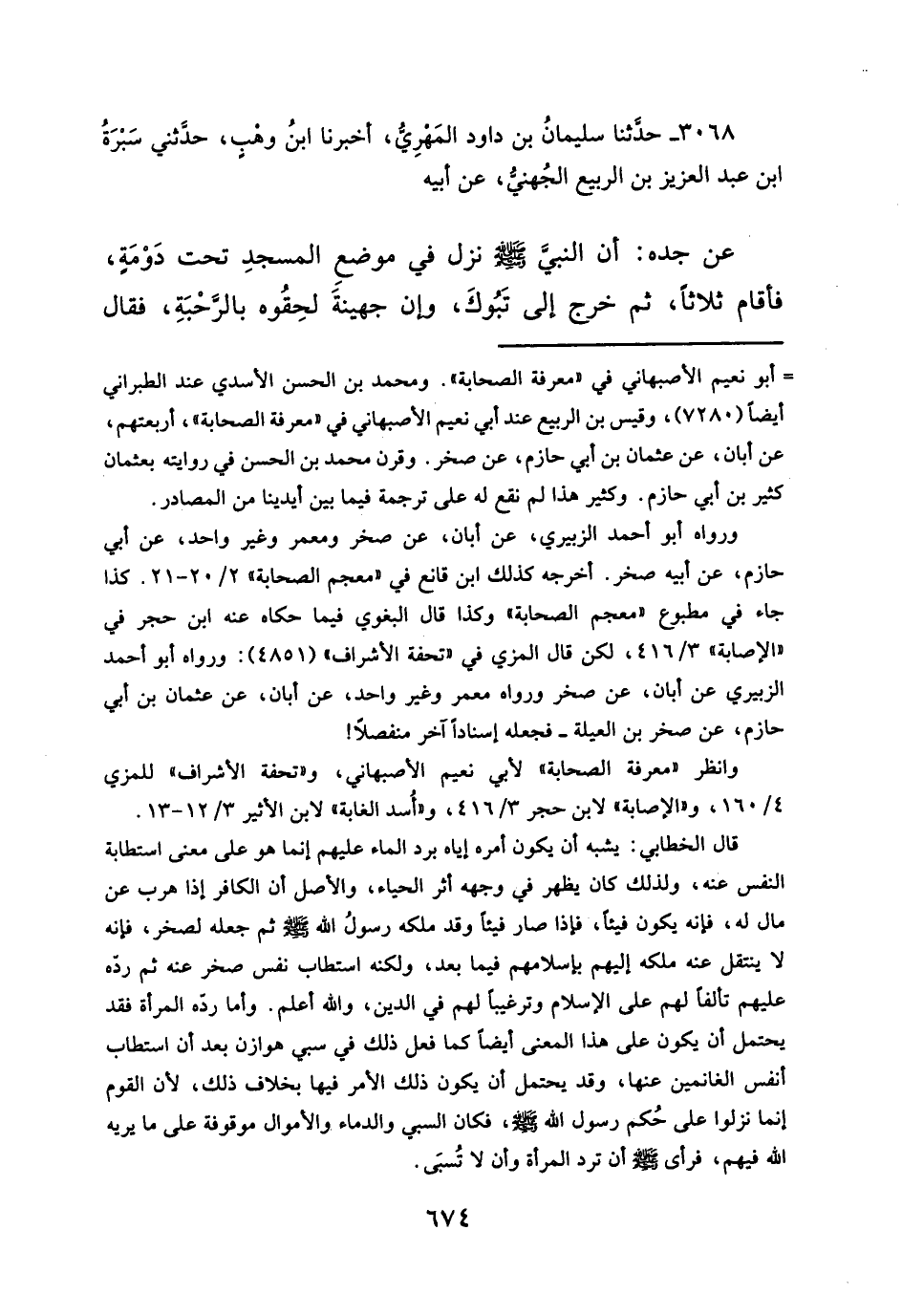 = أبو نعيم الأصبهاني في "معرفة الصحابة". ومحمد بن الحسن الأسدي عند الطبراني أيضاً (٧٢٨٠)، وقيس بن الربيع عند أبي نعيم الأصبهاني في "معرفة الصحابة"، أربعتهم، عن أبان، عن عثمان بن أبي حازم، عن صخر. وقرن محمد بن الحسن في روايته بعثمان كثير بن أبي حازم. وكثير هذا لم نقع له على ترجمة فيما بين أيدينا من المصادر.