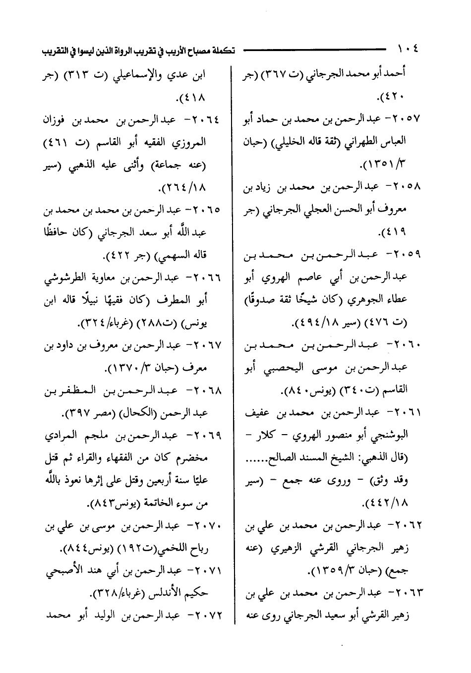 2063 - عبد الرحمن بن محمد بن عليّ بن زهير القرشي أبو سعيد الجرجاني روى عنه ابن عدي والإسماعيلي (ت 313) (جر 418).
