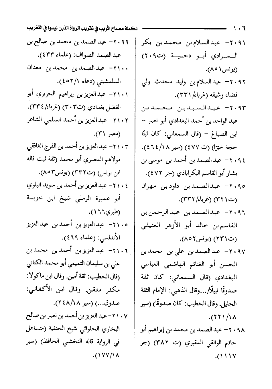 2097 - عبد الصمد بن عليّ بن محمد بن الحسن أبو الغنائم الهاشمي العباسي البغدادي (قال السمعاني: كان ثقة صدوقًا نبيلًا /. . . . وقال الذَّهبي: الإمام الثقة الجليل. وقال الخطيب: كان صدوقًا) (سير 18/ 221).
