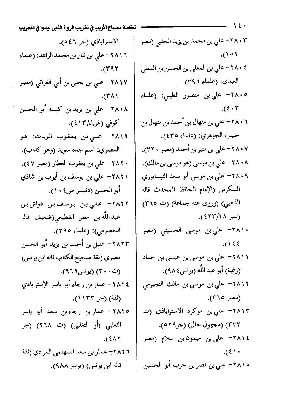 2823 - عليل بن أحمد بن يزيد أبو الحسن مصري (ثقة صحيح الكتاب قاله ابن يونس) (ت 300) (يونس 969).
