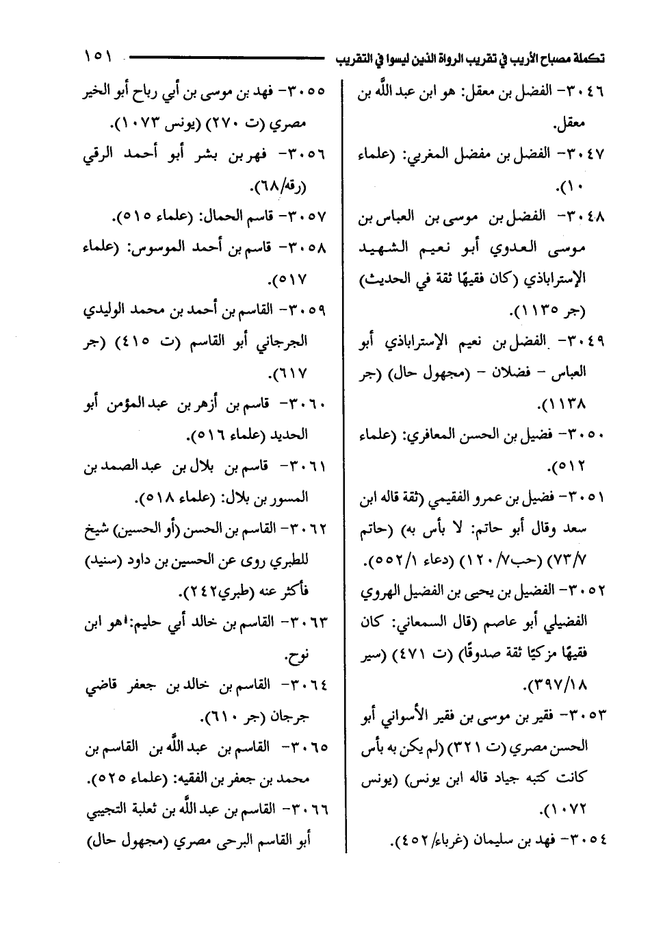 3051 - فضيل بن عمرو الفقيمي (ثقة قاله ابن سعد وقال أبو حاتم: لا بأس به) (حاتم 7/ 73) (حب 7/ 120) (دعاء 1/ 552).
