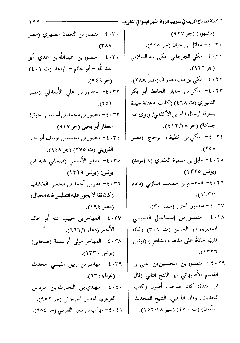4036 - منير بن أحمد بن الحسن الخشاب (كان ثقة لا يجوز عليه التدليس قاله الحبال) (مصر 194).