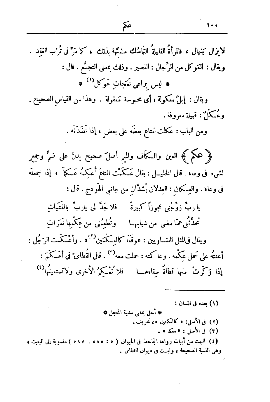 وَيُقَالُ فِي الْمَثَلِ لِلْمُتَسَاوِيَيْنِ: " وَقَعَا كَالْعِكْمَيْنِ ". وَأَعْكَمْتُ الرَّجُلَ: أَعَنْتُهُ عَلَى حَمْلِ عِكْمِهِ. وَعَاكَمْتُهُ: حَمَلْتُ مَعَهُ. قَالَ الْقُطَامِيُّ فِي أَعْكَمَ: