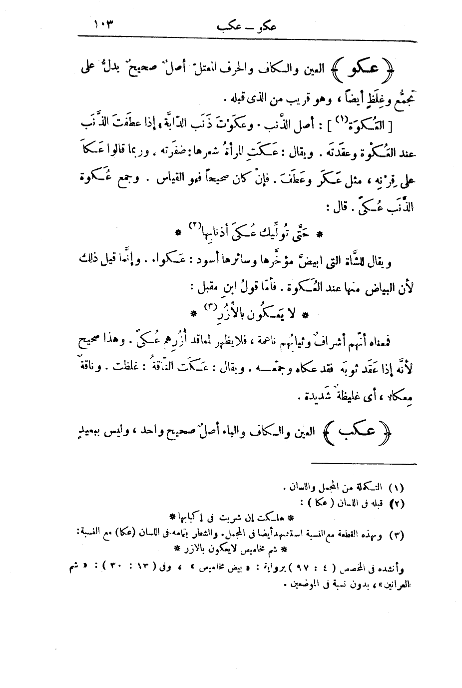 حَتَّى تُوَلِّيَكَ عُكَى أَذْنَابِهَا وَيُقَالُ لِلشَّاةِ الَّتِي ابْيَضَّ مُؤَخَّرُهَا وَسَائِرُهَا أَسْوَدُ: عَكْوَاءُ. وَإِنَّمَا قِيلَ ذَلِكَ لِأَنَّ الْبَيَاضَ مِنْهَا عِنْدَ الْعَُكْوَةِ. فَأَمَّا قَوْلُ ابْنِ مُقْبِلٍ: