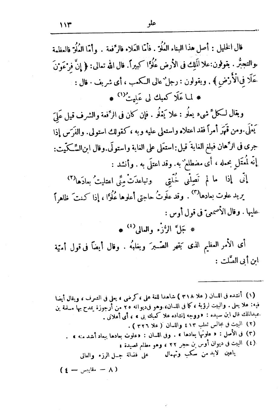 قَالَ الْخَلِيلُ: أَصْلُ هَذَا الْبِنَاءِ الْعُلُوُّ. فَأَمَّا الْعَلَاءُ فَالرِّفْعَةُ. وَأَمَّا الْعُلُوُّ فَالْعَظَمَةُ وَالتَّجَبُّرُ. يَقُولُونَ: عَلَا الْمَلِكُ فِي الْأَرْضِ عُلُوًّا كَبِيرًا. قَالَ اللَّهُ - تَعَالَى: {إِنَّ فِرْعَوْنَ عَلَا فِي الْأَرْضِ} [القصص: 4] ، وَيَقُولُونَ: رَجُلٌ عَالِي الْكَعْبِ، أَيْ شَرِيفٌ. قَالَ:
