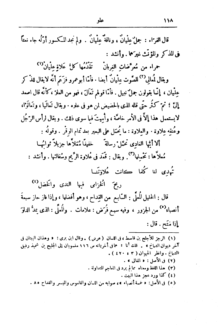 وَيُقَالُ لِمُعَالِي الصَّوْتِ عِلْيَانٌ أَيْضًا. فَأَمَّا أَبُو عَمْرٍو فَزَعَمَ أَنَّهُ لَا يُقَالُ لِلذَّكَرِ عِلْيَانٌ، إِنَّمَا يَقُولُونَ جَمَلٌ نَبِيلٌ. فَأَمَّا قَوْلُهُمْ: تَعَالَ، فَهُوَ مِنَ الْعُلُوِّ، كَأَنَّهُ قَالَ اصْعَدْ إِلَيَّ; ثُمَّ كَثُرَ حَتَّى قَالَهُ الَّذِي بِالْحَضِيضِ لِمَنْ هُوَ فِي عُلُوِّهِ. وَيُقَالُ تَعَالَيَا، وَتَعَالَوْا، لَا يُسْتَعْمَلُ هَذَا إِلَّا فِي الْأَمْرِ خَاصَّةً، وَأُمِيتَ فِيمَا سِوَى ذَلِكَ. وَيُقَالُ لِرَأْسِ الرَّجُلِ وَعُنُقِهِ عِلَاوَةٌ. وَالْعِلَاوَةُ: مَا يُحْمَلُ عَلَى الْبَعِيرِ بَعْدَ تَمَامِ الْوِقْرِ. وَقَوْلُهُ: