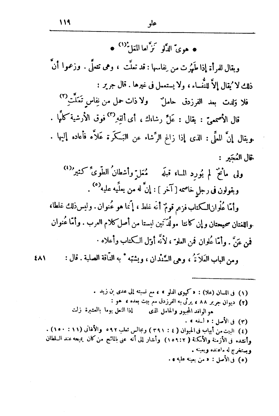 وَأَمَّا عُلْوَانُ الْكِتَابِ فَزَعَمَ قَوْمٌ أَنَّهُ غَلَطٌ، إِنَّمَا هُوَ عُنْوَانٌ. وَلَيْسَ ذَلِكَ غَلَطًا، وَاللُّغَتَانِ صَحِيحَتَانِ وَإِنْ كَانَتَا مُوَلَّدَتَيْنِ لَيْسَتَا مِنْ أَصْلِ كَلَامِ الْعَرَبِ. وَأَمَّا عُنْوَانٌ فَمِنْ عَنَّ. وَأَمَّا عُلْوَانٌ فَمِنَ الْعُلُوِّ، لِأَنَّهُ أَوَّلُ الْكِتَابِ وَأَعْلَاهُ.