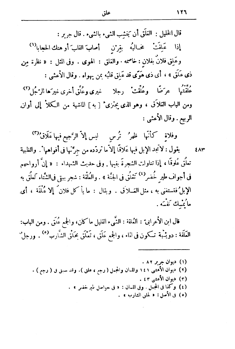 قَالَ الْخَلِيلُ: الْعَلَقُ أَنْ يَنَشِبَ الشَّيْءُ بِالشَّيْءِ. قَالَ جَرِيرٌ: