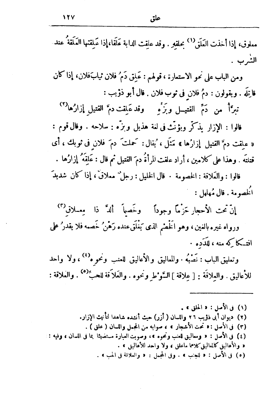 وَمِنَ الْبَابِ عَلَى نَحْوِ الِاسْتِعَارَةِ، قَوْلُهُمْ: عَلِقَ دَمُ فُلَانٍ ثِيَابَ فُلَانٍ، إِذَا كَانَ قَاتِلَهُ. وَيَقُولُونَ: دَمُ فُلَانٍ فِي ثَوْبِ فُلَانٍ. قَالَ أَبُو ذُؤَيْبٍ: