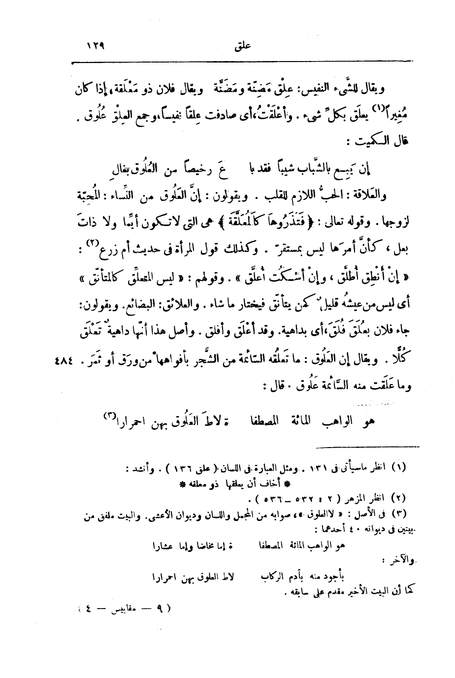 وَالْعَلَاقَةُ: الْحُبُّ اللَّازِمُ لِلْقَلْبِ. وَيَقُولُونَ: إِنَّ الْعَلُوقَ مِنَ النِّسَاءِ: الْمُحِبَّةُ لِزَوْجِهَا. وَقَوْلُهُ تَعَالَى: {فَتَذَرُوهَا كَالْمُعَلَّقَةِ} [النساء: 129] ، هِيَ الَّتِي لَا تَكُونُ أَيِّمًا وَلَا ذَاتَ بَعْلٍ، كَأَنَّ أَمْرَهَا لَيْسَ بِمُسْتَقِرٍّ. وَكَذَلِكَ قَوْلُ الْمَرْأَةِ فِي حَدِيثِ أُمِّ زَرْعٍ: «إِنْ أَنْطِقْ أُطَلَّقْ، وَإِنْ أَسْكُتْ أُعْلَّقْ» . وَقَوْلُهُمْ: " لَيْسَ الْمُتَعَلِّقُ كَالْمُتَأَنِّقِ " أَيْ لَيْسَ مَنْ عَيْشُهُ قَلِيلٌ كَمَنْ يَتَأَنَّقُ فَيَخْتَارُ مَا شَاءَ. وَالْعَلَائِقُ: الْبَضَائِعُ. وَيَقُولُونَ: جَاءَ فُلَانٌ بِعُلَقَ فُلَقَ، أَيْ بِدَاهِيَةٍ. وَقَدْ أَعْلَقَ وَأَفْلَقَ. وَأَصْلُ هَذَا أَنَّهَا دَاهِيَةٌ تَعْلَقُ كُلًّا. وَيُقَالُ إِنَّ الْعَلُوقَ: مَا تَعْلُقُهُ السَّائِمَةُ مِنَ الشَّجَرِ بِأَفْوَاهِهَا مِنْ وَرَقٍ أَوْ ثَمَرٍ. وَمَا عَلَقَتْ مِنْهُ السَّائِمَةُ عَلُوقٌ. قَالَ: