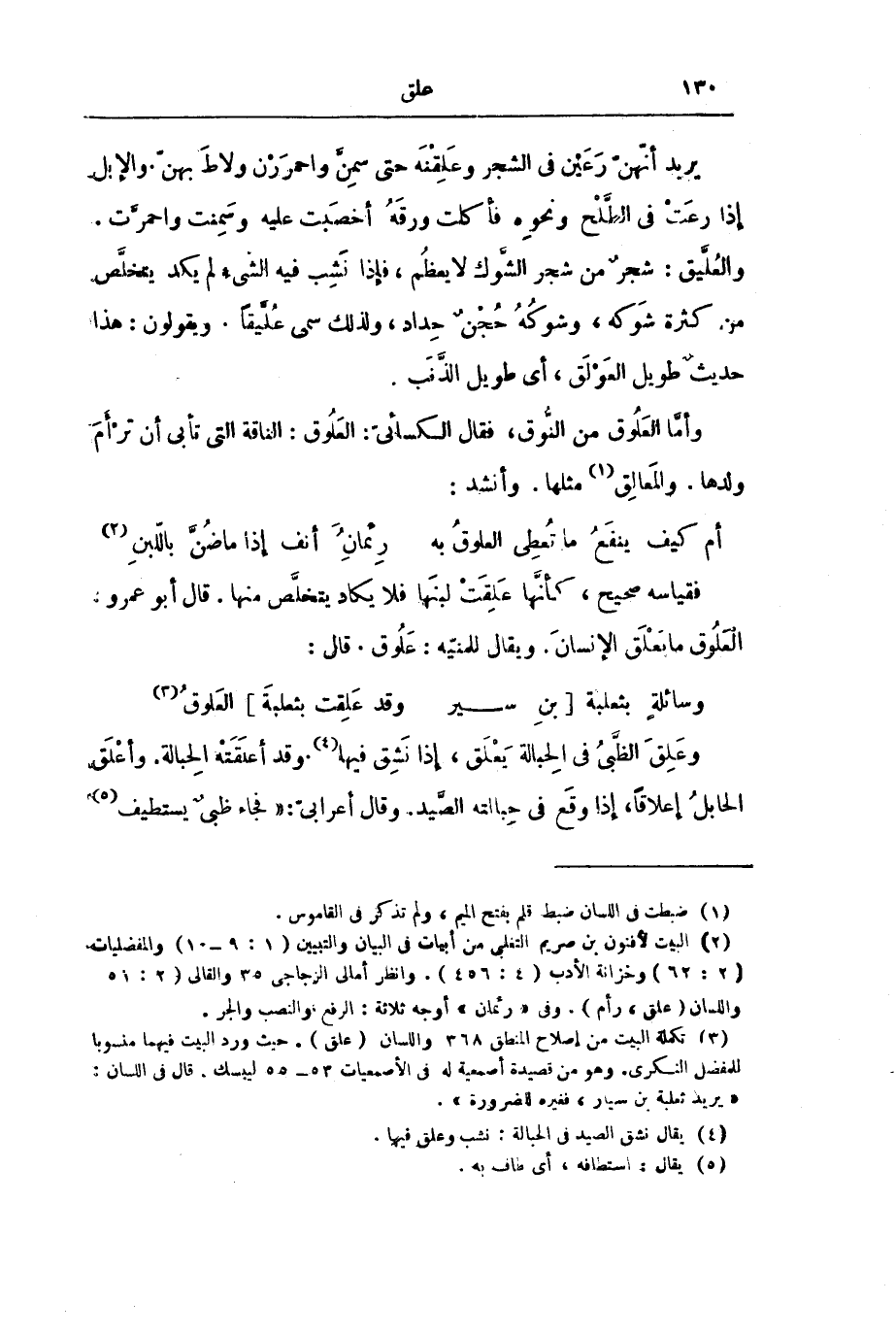 يُرِيدُ أَنَّهُنَّ رَعَيْنَ فِي الشَّجَرِ وَعَلِقْنَهُ حَتَّى سَمِنَّ وَاحْمَرَرْنَ وَلَاطَ بِهِنَّ. وَالْإِبِلُ إِذَا رَعَتْ فِي الطَّلْحِ وَنَحْوِهِ فَأَكَلَتْ وَرَقَهُ أَخْصَبَتْ عَلَيْهِ وَسَمِنَتْ وَاحْمَرَّتْ. وَالْعُلَّيْقُ: شَجَرٌ مِنْ شَجَرِ الشَّوْكِ لَا يَعْظُمُ، فَإِذَا نَشِبَ فِيهِ الشَّيْءُ لَمْ يَكَدْ يَتَخَلَّصُ مِنْ كَثْرَةِ شَوْكِهِ، وَشَوْكُهُ حُجْنٌ حِدَادٌ، وَلِذَلِكَ سُمِّيَ عُلَّيْقًا. وَيَقُولُونَ: هَذَا حَدِيثٌ طَوِيلُ الْعَوْلَقِ، أَيْ طَوِيلُ الذَّنَبِ.