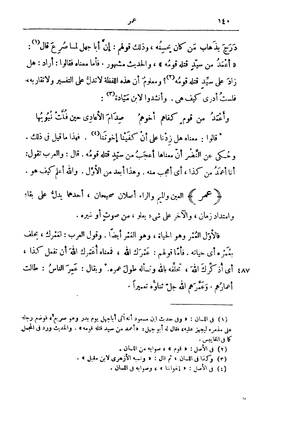 دَرَجَ بِذَهَابِ مَنْ كَانَ يُحْسِنُهُ، وَذَلِكَ قَوْلُهُمْ: إِنَّ أَبَا جَهْلٍ لَمَّا صُرِعَ قَالَ: " أَعْمَدُ مِنْ سَيِّدٍ قَتَلَهُ قَوْمُهُ "، وَالْحَدِيثُ مَشْهُورٌ. فَأَمَّا مَعْنَاهُ فَقَالُوا: أَرَادَ: هَلْ زَادَ عَلَى سَيِّدٍ قَتَلَهُ قَوْمُهُ؟ وَمَعْلُومٌ أَنَّ هَذِهِ اللَّفْظَةَ لَا تَدُلُّ عَلَى التَّفْسِيرِ وَلَا تُقَارِبُهُ، فَلَسْتُ أَدْرِي كَيْفَ هِيَ. وَأَنْشَدُوا لِابْنِ مَيَّادَةَ: