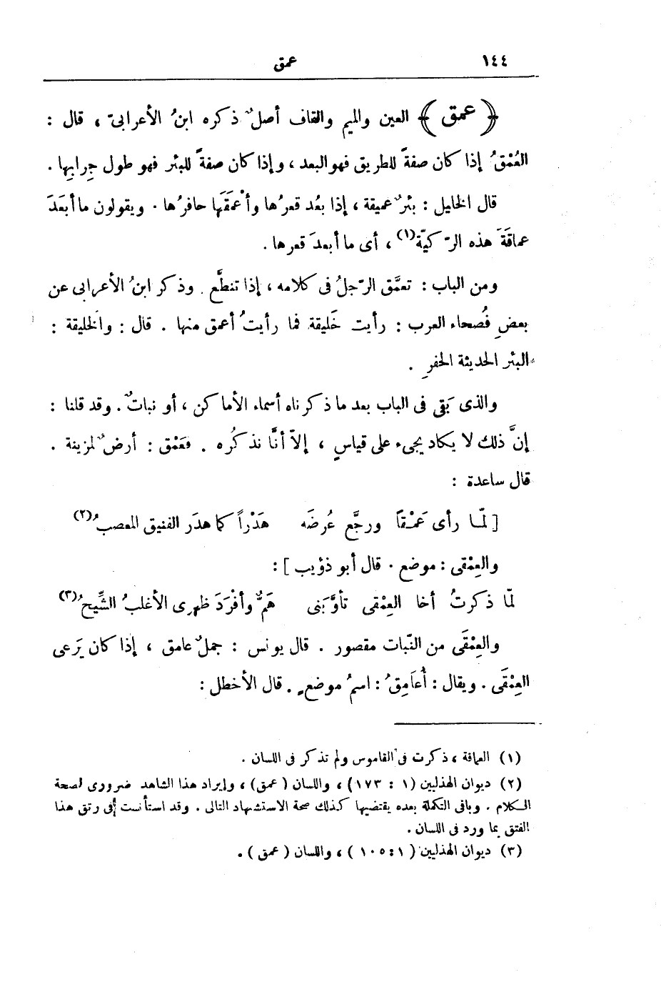 قَالَ الْخَلِيلُ: بِئْرٌ عَمِيقَةٌ، إِذَا بَعُدَ قَعْرُهَا وَأَعْمَقَهَا حَافِرُهَا. وَيَقُولُونَ مَا أَبْعَدَ عَمَاقَةَ هَذِهِ الرَّكِيَّةِ، أَيْ مَا أَبْعَدَ قَعْرَهَا.