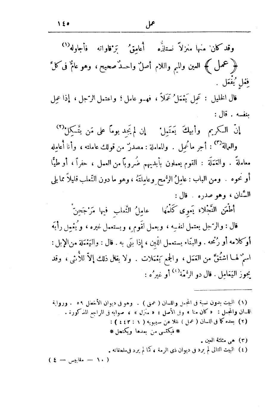 قَالَ: وَالرَّجُلُ يَعْتَمِلُ لِنَفْسِهِ، وَيَعْمَلُ لِقَوْمٍ، وَيَسْتَعْمِلُ غَيْرَهُ، وَيُعْمِلُ رَأْيَهُ أَوْ كَلَامَهُ أَوْ رُمْحَهُ. وَالْبَنَّاءُ يُسْتَعْمَلُ اللَّبِنَ، إِذَا بَنَى بِهِ. قَالَ: وَالْيَعْمَلَةُ مِنَ الْإِبِلِ: اسْمٌ لَهَا اشْتُقَّ مِنَ الْعَمَلِ، وَالْجَمْعُ يَعْمَلَاتٌ. وَلَا يُقَالُ ذَلِكَ إِلَّا لِلْأُنْثَى، وَقَدْ يَجُوزُ الْيَعَامِلُ. قَالَ ذُو الرُّمَّةِ أَوْ غَيْرُهُ: