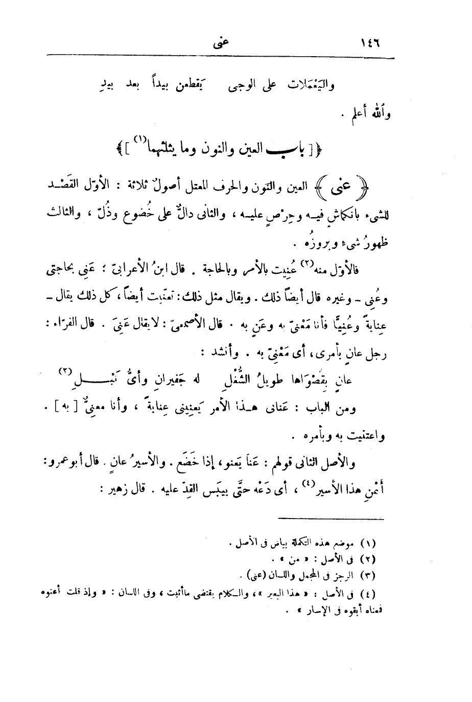 فَالْأَوَّلُ مِنْهُ عُنِيتُ بِالْأَمْرِ وَبِالْحَاجَةِ. قَالَ ابْنُ الْأَعْرَابِيِّ: عَنِيَ بِحَاجَتِي وَعُنِيَ - وَغَيْرُهُ قَالَ أَيْضًا ذَلِكَ. وَيُقَالُ مِثْلُ ذَلِكَ: تَعَنَّيْتُ أَيْضًا، كُلُّ ذَلِكَ يُقَالُ - عِنَايَةً وَعُنِيًّا فَأَنَا مَعْنِيٌّ بِهِ وَعَنٍ بِهِ. قَالَ الْأَصْمَعِيُّ: لَا يُقَالُ عَنِيَ. قَالَ الْفَرَّاءُ: رَجُلٌ عَانٍ بِأَمْرِي، أَيْ مَعْنِيٌّ بِهِ. وَأَنْشَدَ: