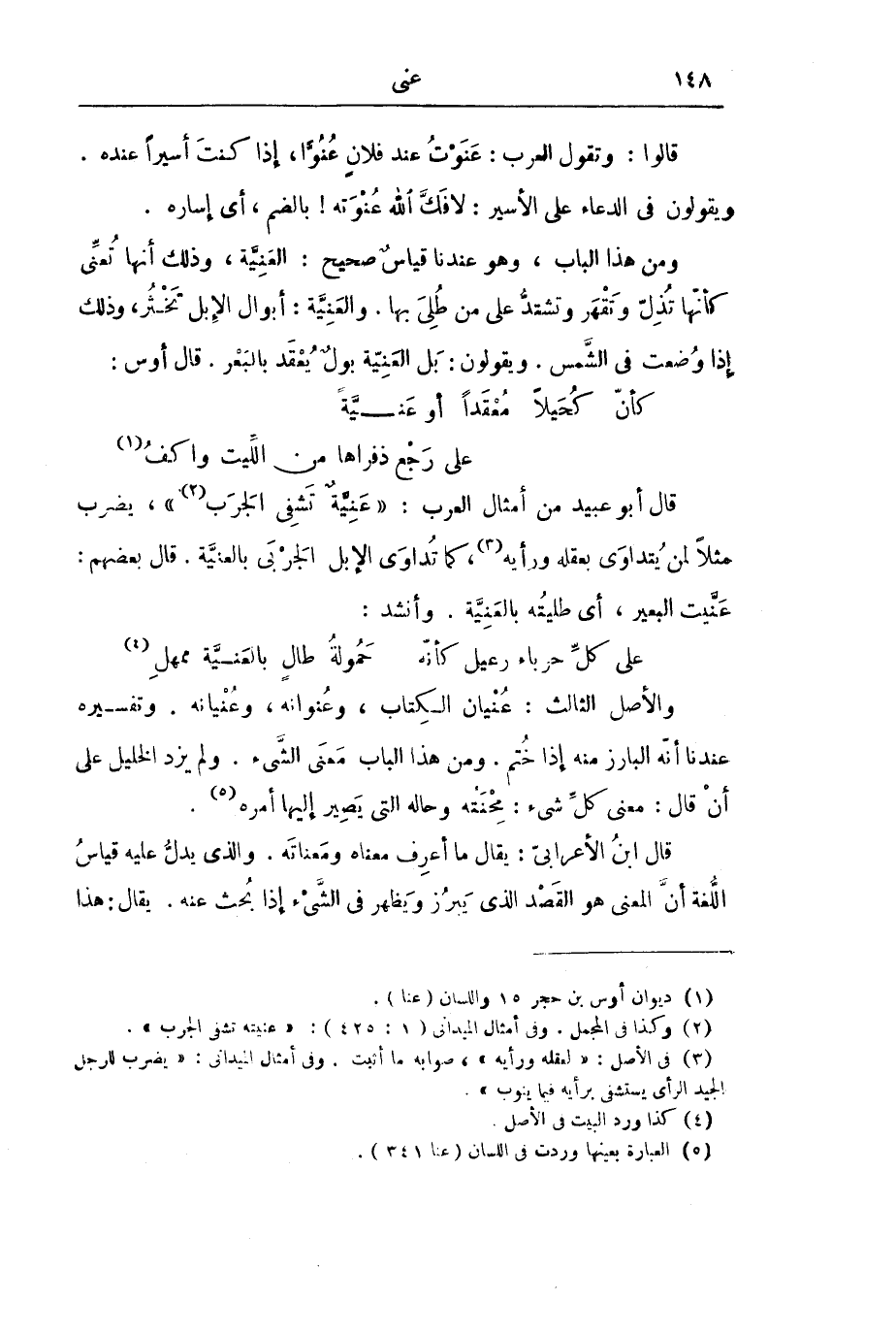 وَالْأَصْلُ الثَّالِثُ: عُنْيَانُ الْكِتَابِ، وَعُنْوَانُهُ، وَعُنْيَانُهُ. وَتَفْسِيرُهُ عِنْدَنَا أَنَّهُ الْبَارِزُ مِنْهُ إِذَا خُتِمَ. وَمِنْ هَذَا الْبَابِ مَعْنَى الشَّيْءِ. وَلَمْ يَزِدِ الْخَلِيلُ عَلَى أَنْ قَالَ: مَعْنَى كُلِّ شَيْءٍ: مِحْنَتُهُ وَحَالُهُ الَّتِي يَصِيرُ إِلَيْهَا أَمْرُهُ.