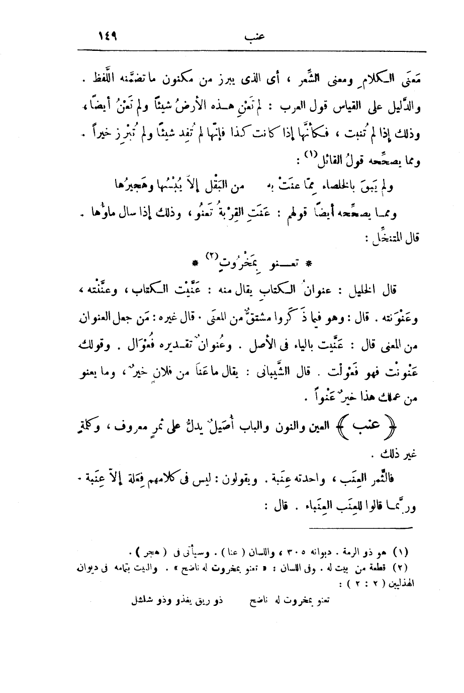 مَعْنَى الْكَلَامِ وَمَعْنَى الشِّعْرِ، أَيِ الَّذِي يَبْرُزُ مِنْ مَكْنُونِ مَا تَضَمَّنَهُ اللَّفْظُ. وَالدَّلِيلُ عَلَى الْقِيَاسِ قَوْلُ الْعَرَبِ: لَمْ تَعْنِ هَذِهِ الْأَرْضُ شَيْئًا وَلَمْ تَعْنُ أَيْضًا، وَذَلِكَ إِذَا لَمْ تُنْبِتْ، فَكَأَنَّهَا إِذْ كَانَتْ كَذَا فَإِنَّهَا لَمْ تُفِدْ شَيْئًا وَلَمْ تُبْرِزْ خَيْرًا. وَمِمَّا يُصَحِّحُهُ قَوْلُ الْقَائِلِ: