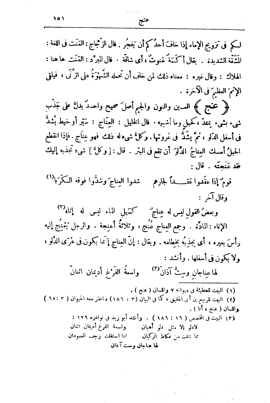 الْإِتَاءُ: الْمَادَّةُ. وَجَمْعُ الْعِنَاجِ عُنُجٌ، وَثَلَاثَةُ أَعْنِجَةٍ. وَالرَّجُلُ يَعْنُِجُ إِلَيْهِ رَأْسَ بَعِيرِهِ، أَيْ يَجْذِبُهُ بِخِطَامِهِ. وَيُقَالُ: إِنَّ الْعِنَاجَ إِنَّمَا يَكُونُ فِي عُرَى الدَّلْوِ، وَلَا يَكُونُ فِي أَسْفَلِهَا. وَأَنْشَدَ: