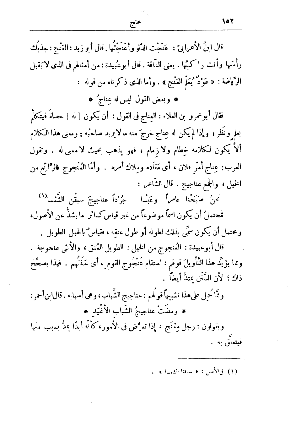 فَقَالَ أَبُو عَمْرِو بْنُ الْعَلَاءِ: الْعِنَاجُ فِي الْقَوْلِ: أَنْ يَكُونَ [لَهُ] حَصَاةٌ فَيَتَكَلَّمُ بِعِلْمٍ وَنَظَرٍ، وَإِذَا لَمْ يَكُنْ لَهُ عِنَاجٌ خَرَجَ مِنْهُ مَا لَا يُرِيدُ صَاحِبُهُ. وَمَعْنَى هَذَا الْكَلَامِ أَلَّا يَكُونَ لِكَلَامِهِ خِطَامٌ وَلَا زِمَامٌ، فَهُوَ يَذْهَبُ بِحَيْثُ لَا مَعْنَى لَهُ. وَتَقُولُ الْعَرَبُ: عِنَاجُ أَمْرِ فُلَانٍ، أَيْ مَقَادُهُ وَمِلَاكُ أَمْرِهِ. وَأَمَّا الْعُنْجُوجُ فَالرَّائِعُ مِنَ الْخَيْلِ، وَالْجَمْعُ عَنَاجِيجُ. قَالَ الشَّاعِرُ: