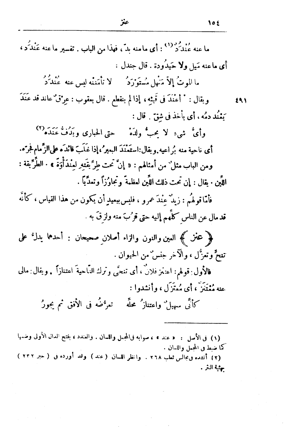 فَأَمَّا قَوْلُهُمْ: زَيْدٌ عِنْدَ عَمْرٍو، فَلَيْسَ بِبَعِيدٍ أَنْ يَكُونَ مِنْ هَذَا الْقِيَاسِ، كَأَنَّهُ قَدْ مَالَ عَنِ النَّاسِ كُلِّهِمْ إِلَيْهِ حَتَّى قَرُبَ مِنْهُ وَلَزِقَ بِهِ.