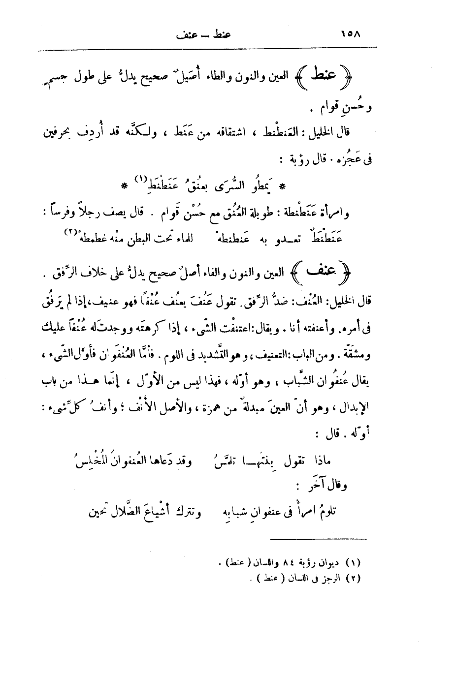 قَالَ الْخَلِيلُ: الْعَنَطْنَطُ، اشْتِقَاقُهُ مِنْ عَنَطَ، وَلَكِنَّهُ قَدْ أُرْدِفَ بِحَرْفَيْنِ فِي عَجُزِهِ. قَالَ رُؤْبَةُ: