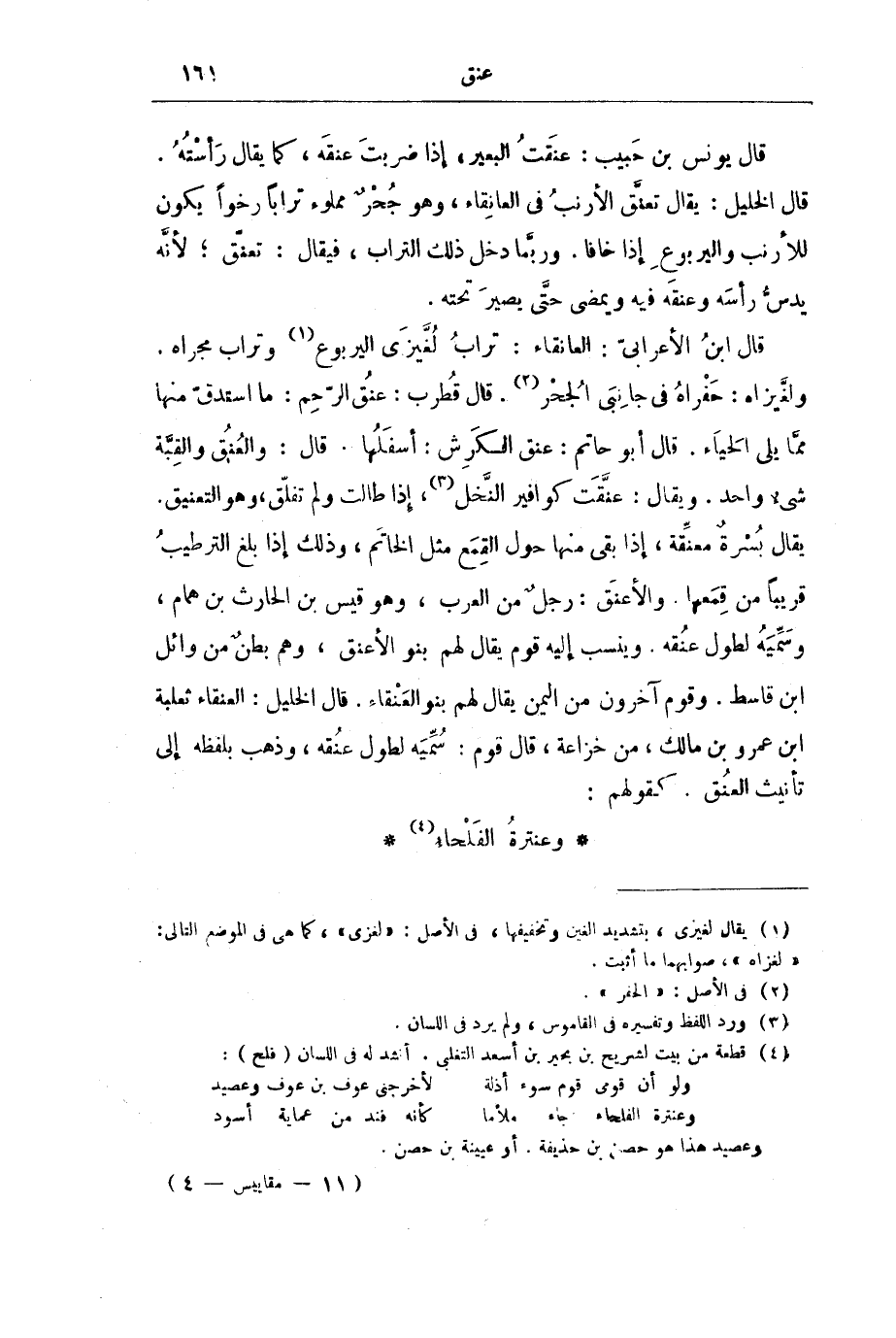 قَالَ ابْنُ الْأَعْرَابِيِّ: الْعَانِقَاءُ: تُرَابٌ لُغَّيْزَى الْيَرْبُوعِ وَتُرَابُ مَجْرَاهُ. وَلُغَّيْزَاهُ: حَفْرَاهُ فِي جَانِبَيِ الْجُحْرِ. قَالَ قُطْرُبٌ: عُنُقُ الرَّحِمِ: مَا اسْتَدَقَّ مِنْهَا مِمَّا يَلِي الْحَيَاءَ. قَالَ أَبُو حَاتِمٍ: عُنُقُ الْكَرِشِ: أَسْفَلُهَا. قَالَ: وَالْعُنُقُ وَالْقِبَّةُ شَيْءٌ وَاحِدٌ. وَيُقَالُ: عَنَّقَتْ كَوَافِيرُ النَّخْلِ، إِذَا طَالَتْ وَلَمْ تُفَلِّقْ، وَهُوَ التَّعْنِيقُ. يُقَالُ بُسْرَةٌ مُعَنِّقَةٌ، إِذَا بَقِيَ مِنْهَا حَوْلَ الْقِمَعِ مِثْلُ الْخَاتَمِ، وَذَلِكَ إِذَا بَلَغَ التَّرْطِيبُ قَرِيبًا مِنْ قِمَعِهَا. وَالْأَعْنَقُ: رَجُلٌ مِنَ الْعَرَبِ، وَهُوَ قَيْسُ بْنُ الْحَارِثِ بْنِ هَمَّامٍ، وَسُمِّيَهُ لِطُولِ عُنُقِهِ. وَيُنْسَبُ إِلَيْهِ قَوْمٌ يُقَالُ لَهُمْ بَنُو الْأَعْنَقِ، وَهُمْ بَطْنٌ مِنْ وَائِلِ بْنِ قَاسِطٍ. وَقَوْمٌ آخَرُونَ مِنَ الْيَمَنِ يُقَالُ لَهُمْ بَنُو الْعَنْقَاءِ. قَالَ الْخَلِيلُ: الْعَنْقَاءُ ثَعْلَبَةُ بْنُ عَمْرِو بْنِ مَالِكٍ، مِنْ خُزَاعَةَ، قَالَ قَوْمٌ: سُمِّيَهُ لِطُولِ عُنُقِهِ، وَذَهَبَ بِلَفْظِهِ إِلَى تَأْنِيثِ الْعُنُقِ. كَقَوْلِهِمْ: