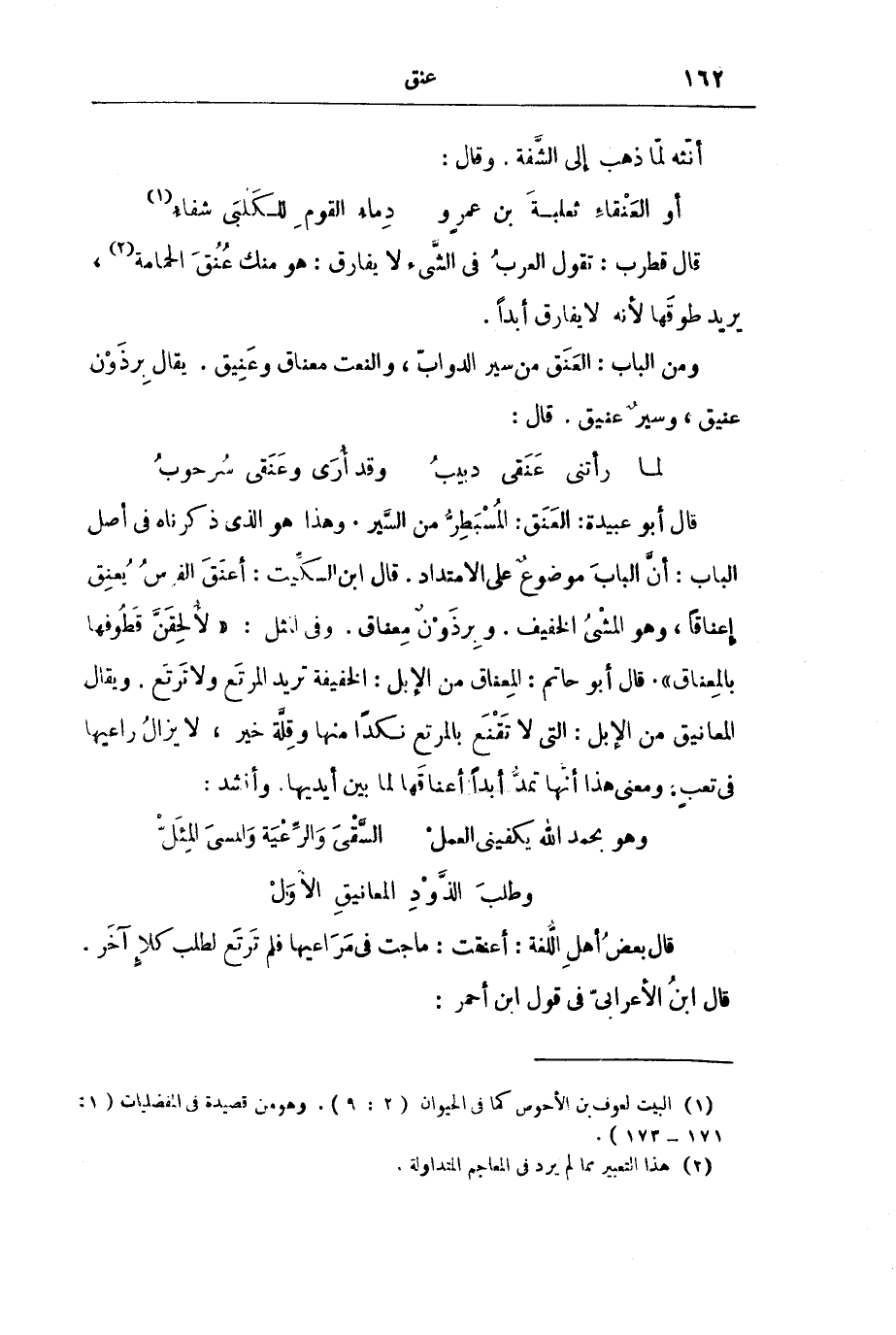 قَالَ أَبُو عُبَيْدَةَ: الْعَنَقُ: الْمُسْبَطِرُّ مِنَ السَّيْرِ. وَهَذَا هُوَ الَّذِي ذَكَرْنَاهُ فِي أَصْلِ الْبَابِ: أَنَّ الْبَابَ مَوْضُوعٌ عَلَى الِامْتِدَادِ. قَالَ ابْنُ السِّكِّيتِ: أَعْنَقَ الْفَرَسُ يُعْنِقُ إِعْنَاقًا، وَهُوَ الْمَشْيُ الْخَفِيفُ. وَبِرْذَوْنٌ مِعْنَاقٌ. وَفِي الْمَثَلِ: " لَأُلْحِقَنَّ قَطُوفَهَا بِالْمِعْنَاقِ ". قَالَ أَبُو حَاتِمٍ: الْمِعْنَاقُ مِنَ الْإِبِلِ: الْخَفِيفَةُ تُرِيدُ الْمَرْتَعَ وَلَا تَرْتَعُ. وَيُقَالُ الْمَعَانِيقُ مِنَ الْإِبِلِ: الَّتِي لَا تَقْنَعُ بِالْمَرْتَعِ نَكَدًا مِنْهَا وَقِلَّةَ خَيْرٍ، لَا يَزَالُ رَاعِيهَا فِي تَعَبٍ. وَمَعْنَى هَذَا أَنَّهَا تَمُدُّ أَبَدًا أَعْنَاقَهَا لِمَا بَيْنَ أَيْدِيهَا. وَأَنْشَدَ: