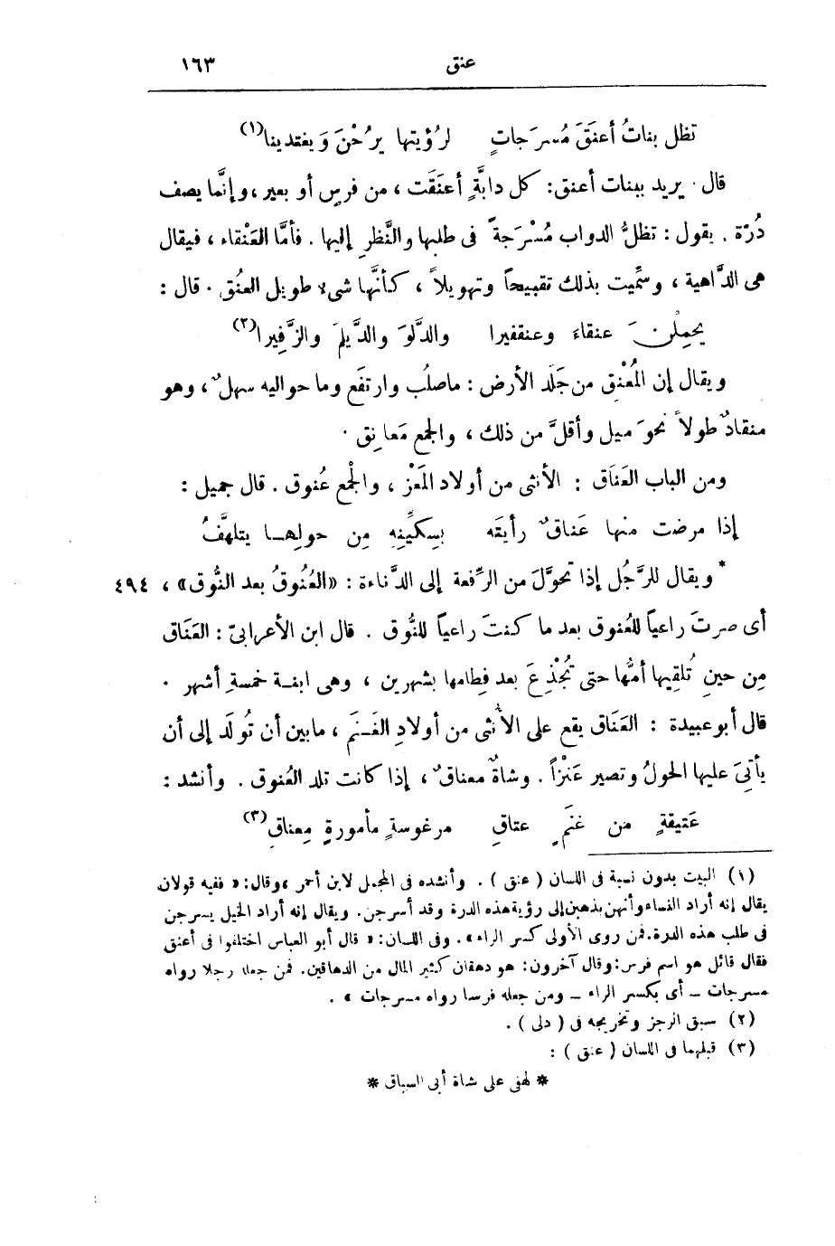 وَيُقَالُ لِلرَّجُلِ إِذَا تَحَوَّلَ مِنَ الرِّفْعَةِ إِلَى الدَّنَاءَةِ: " الْعُنُوقُ بَعْدَ النُّوقِ "، أَيْ صِرْتَ رَاعِيًا لِلْعُنُوقِ بَعْدَمَا كُنْتَ رَاعِيًا لِلنُّوقِ. قَالَ ابْنُ الْأَعْرَابِيِّ: الْعَنَاقُ مِنْ حِينِ تُلْقِيهَا أُمُّهَا حَتَّى تُجْذِعَ بَعْدَ فِطَامِهَا بِشَهْرَيْنِ، وَهِيَ ابْنَةُ خَمْسَةِ أَشْهُرٍ. قَالَ أَبُو عُبَيْدَةَ: الْعَنَاقُ يَقَعُ عَلَى الْأُنْثَى مِنْ أَوْلَادِ الْغَنَمِ، مَا بَيْنَ أَنْ تُولَدَ إِلَى أَنْ يَأْتِيَ عَلَيْهَا الْحَوْلُ وَتَصِيرَ عَنْزًا. وَشَاةٌ مِعْنَاقٌ، إِذَا كَانَتْ تَلِدُ الْعُنُوقَ. وَأَنْشَدَ: