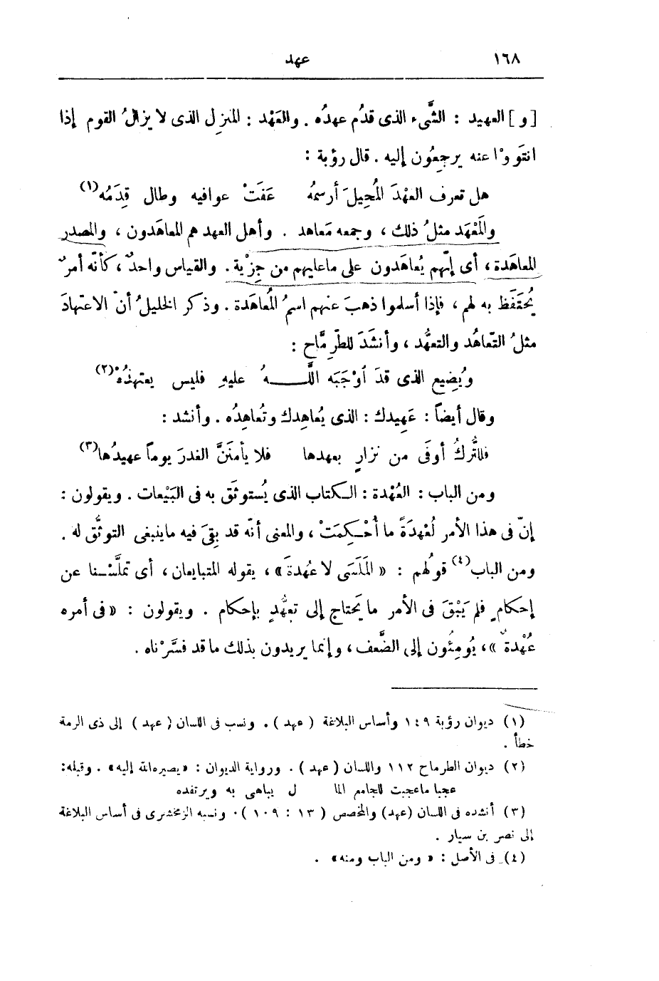 وَالْمَعْهَدُ مِثْلُ ذَلِكَ، وَجَمْعُهُ مَعَاهِدُ. وَأَهْلُ الْعَهْدِ هُمُ الْمُعَاهَدُونَ، وَالْمَصْدَرُ الْمُعَاهَدَةُ، أَيْ إِنَّهُمْ يُعَاهَدُونَ عَلَى مَا عَلَيْهِمْ مِنْ جِزْيَةٍ. وَالْقِيَاسُ وَاحِدٌ، كَأَنَّهُ أَمْرٌ يُحْتَفَظُ بِهِ لَهُمْ، فَإِذَا أَسْلَمُوا ذَهَبَ عَنْهُمُ اسْمُ الْمُعَاهَدَةِ. وَذَكَرَ الْخَلِيلُ أَنَّ الِاعْتِهَادَ مِثْلُ التَّعَاهُدِ وَالتَّعَهُّدِ، وَأَنْشَدَ لِلطِّرِمَّاحِ: