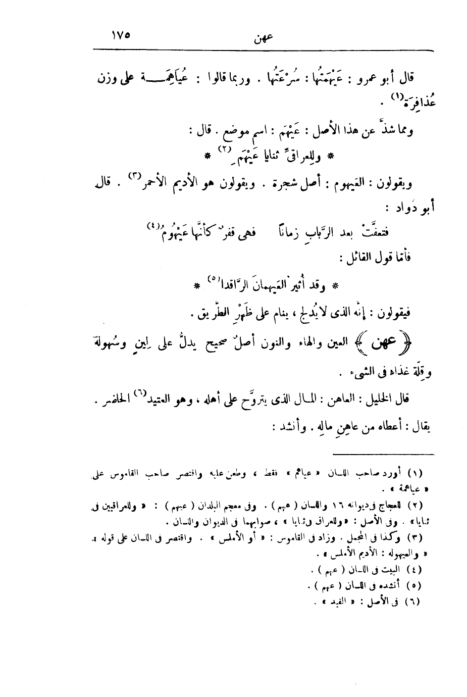 وَيَقُولُونَ: الْعَيْهُومُ: أَصْلُ شَجَرَةٍ. وَيَقُولُونَ هُوَ الْأَدِيمُ الْأَحْمَرُ. قَالَ أَبُو دُوَادٍ: