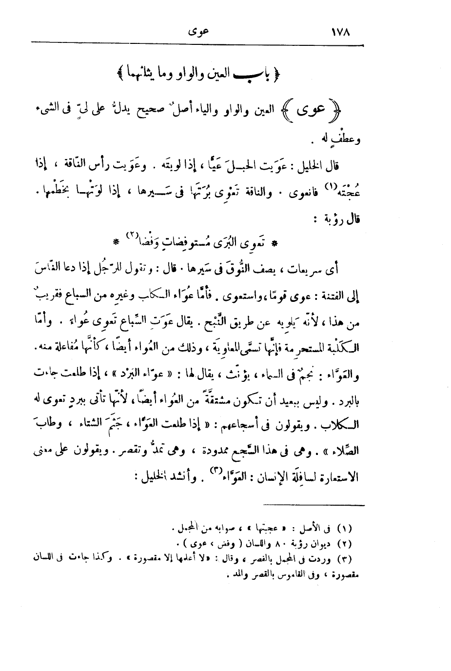 أَيْ سَرِيعَاتٍ، يَصِفُ النُّوقَ فِي سَيْرِهَا. قَالَ: وَتَقُولُ لِلرَّجُلِ إِذَا دَعَا النَّاسَ إِلَى الْفِتْنَةِ: عَوَى قَوْمًا، وَاسْتَعْوَى. فَأَمَّا عُوَاءُ الْكَلْبِ وَغَيْرِهِ مِنَ السِّبَاعِ فَقَرِيبٌ مِنْ هَذَا، لِأَنَّهُ يَلْوِيهِ عَنْ طَرِيقِ النَّبْحِ. يُقَالُ عَوَتِ السِّبَاعُ تَعْوِي عُوَاءً. وَأَمَّا الْكَلْبَةُ الْمُسْتَحْرِمَةُ فَإِنَّهَا تُسَمَّى الْمُعَاوِيَةَ، وَذَلِكَ مِنَ الْعُوَاءِ أَيْضًا، كَأَنَّهَا مُفَاعَلِةٌ مِنْهُ. وَالْعَوَّاءُ: نَجْمٌ فِي السَّمَاءِ، يُؤَنَّثُ، يُقَالُ لَهَا: " عَوَّاءُ الْبَرْدِ "، إِذَا طَلَعَتْ جَاءَتْ بِالْبَرْدِ. وَلَيْسَ بِبَعِيدٍ أَنْ تَكُونَ مُشْتَقَّةً مِنَ الْعُوَاءِ أَيْضًا، لِأَنَّهَا تَأْتِي بِبَرْدٍ تَعْوِي لَهُ الْكِلَابُ. وَيَقُولُونَ فِي أَسْجَاعِهِمْ: " إِذَا طَلَعَتِ الْعَوَّاءُ، جَثَمَ الشِّتَاءُ، وَطَابَ الصِّلَاءُ ". وَهِيَ فِي هَذَا السَّجْعِ مَمْدُودَةٌ، وَهِيَ تُمَدُّ وَتُقْصَرُ. وَيَقُولُونَ عَلَى مَعْنَى الِاسْتِعَارَةِ لِسَافِلَةِ الْإِنْسَانِ: الْعَوَّاءُ. وَأَنْشَدَ الْخَلِيلُ: